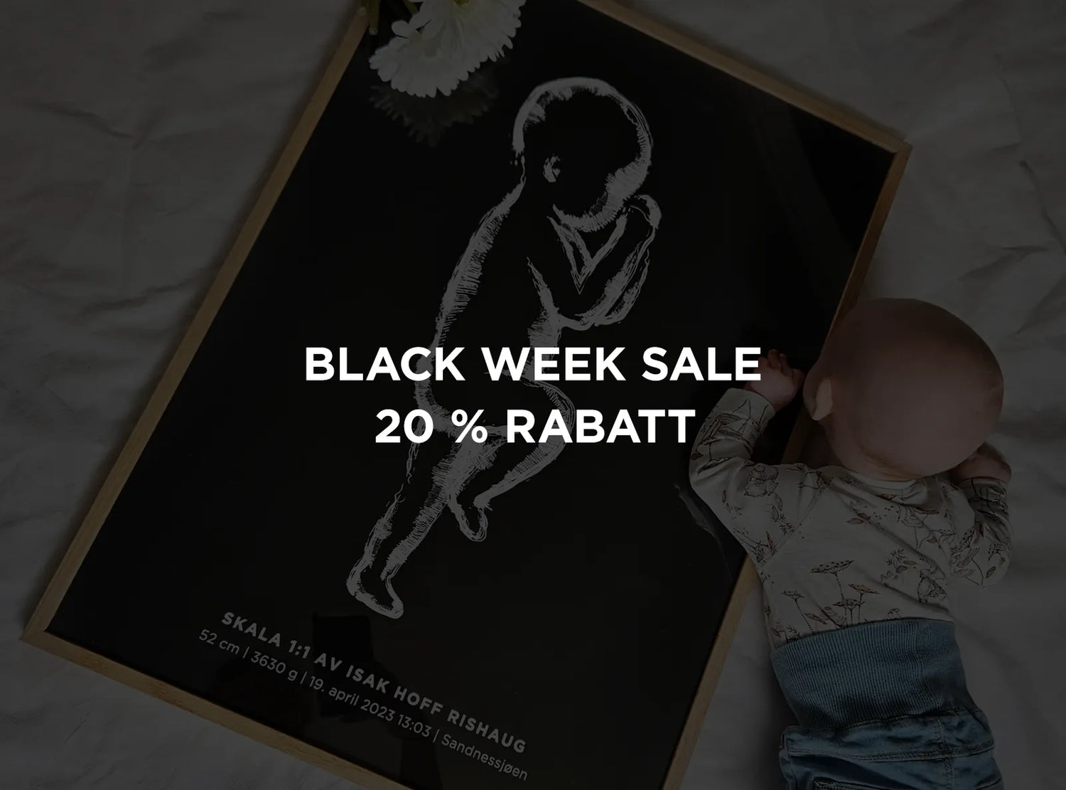 En fødselsplakat i 1:1 skala viser ditt barns faktiske størrelse ved fødselen. Det vil si at illustrasjonen på plakaten er like lang som babyen din var da han eller hun ble født. Velg design og oppgi babyens navn, fødselsdato, lengde og vekt. Deretter forvandler vi denne informasjonen til et helt unikt kunstverk som du og familien din vil sette pris på i mange år fremover.